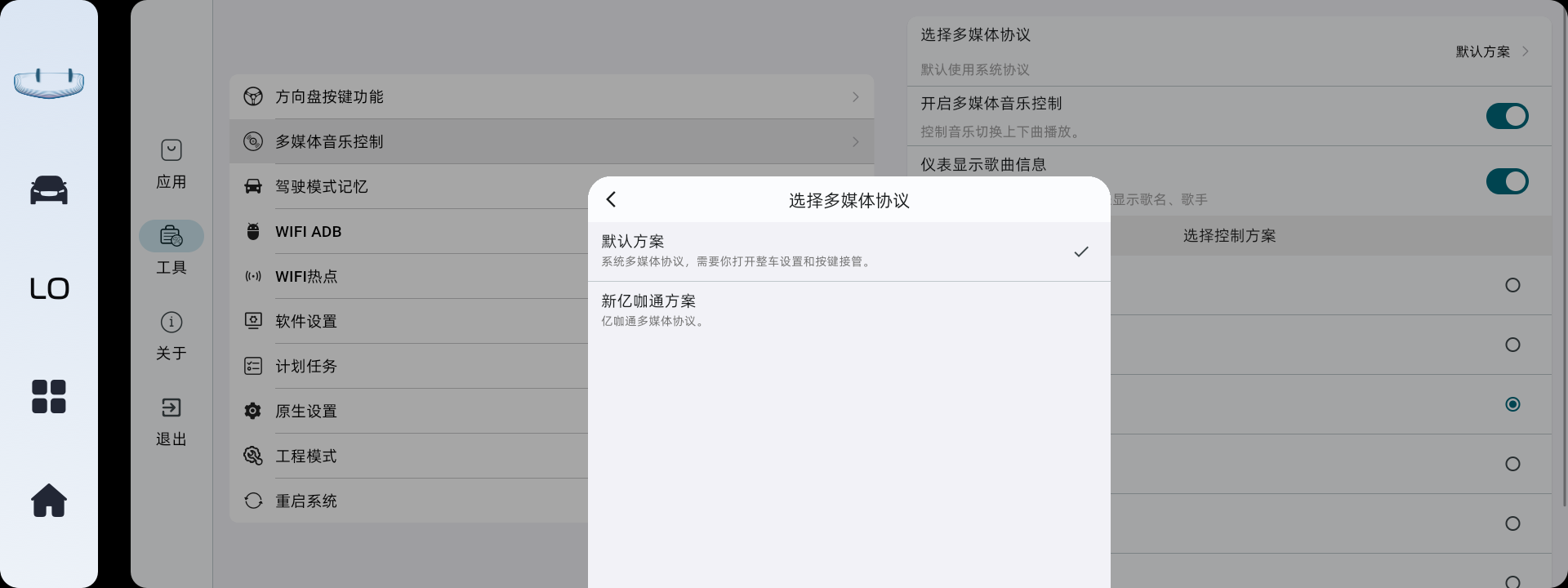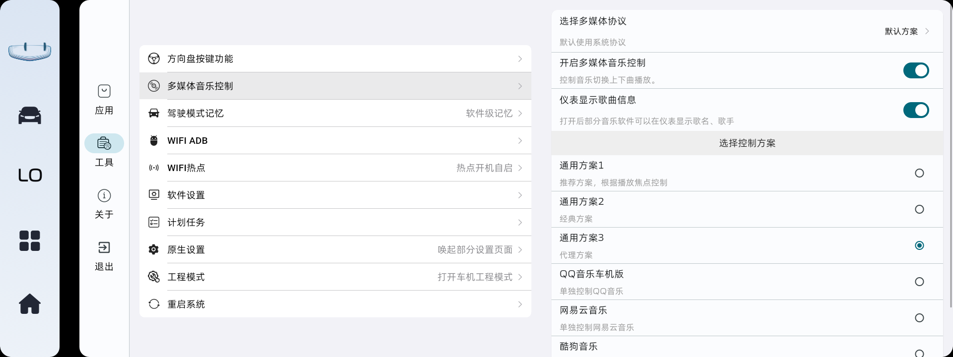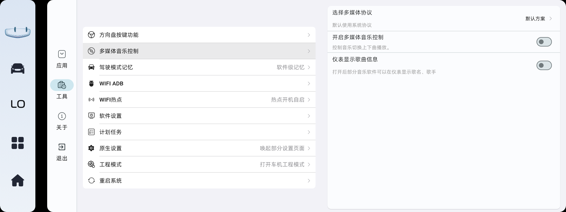 不是多媒体控制、不是多媒体控制、不是多媒体控制!不能控制除原车自带以外的音乐软件切歌,第三方音乐软件切歌请安装对应的音乐助手。驾驶模式记忆:软件级记忆,也就是说,软件没有被运行就不能自动切换你想要的模式,软件被运行的首要条件是车机正常开机,没有开机软件就运行不了。比如车机死机,记忆功能就会失效。