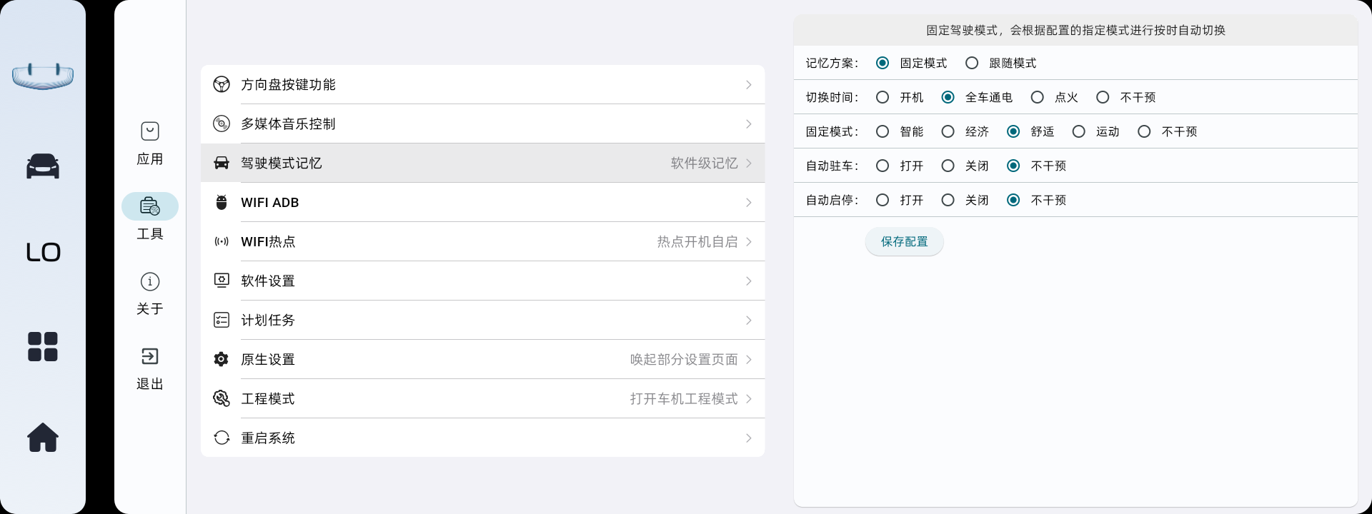 记忆方案中选择了跟随模式,车机助手会根据最近一次切换的模式进行记忆、按时自动切换。注意,跟随模式只会对驾驶模式进行记忆,对于启停、自动驻车等功能不会记忆跟随。