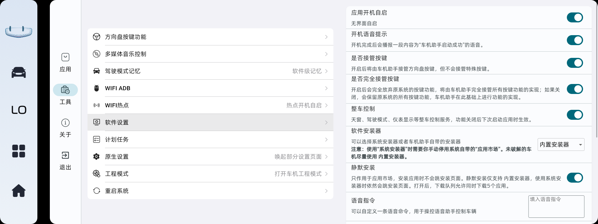 软件默认没有开启任何功能、软件默认没有开启任何功能、软件默认没有开启任何功能,需要进入车机助手找到