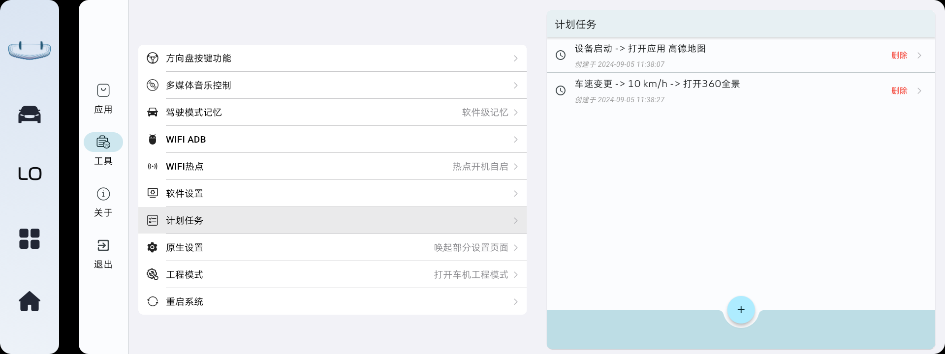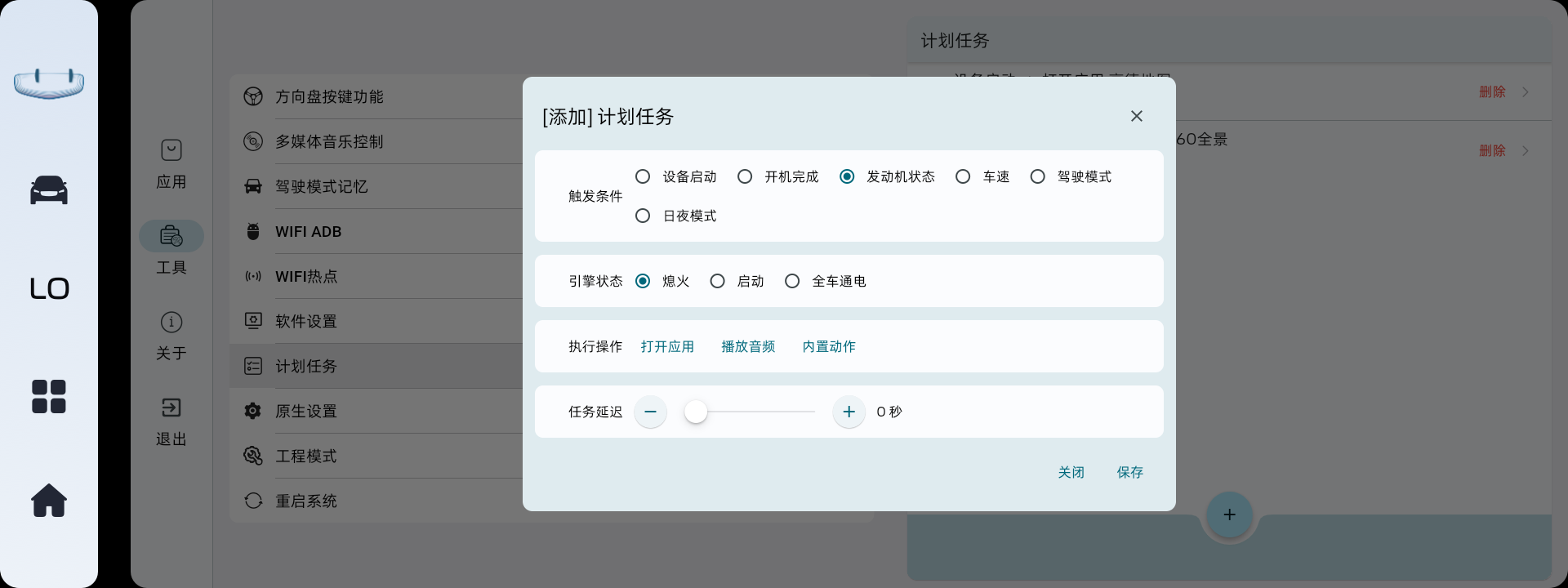 v1.0.8新增计划任务,可以根据不同场景触发设定的任务。如,开机打开应用、速度10km/h打开360全景等等。不确定可靠性,慎用。