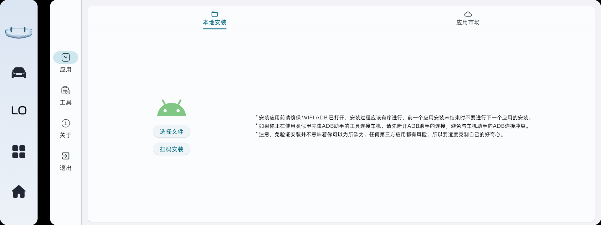 降级安装按钮,用于低版本应用的安装。v1.0.5: 为了更方便安装应用,新增了扫码安装,手机扫码后会进入一个网页表单,根据提示选择对应安装包后点击安装,即可自动将应用安装到车机端。